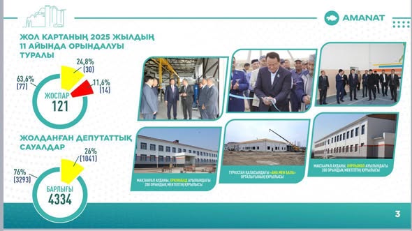 Партияның Сайлауалды бағдарламасын Түркістан облысында іске асыру жөніндегі Жол картасында 136 индикатор, 568 іс-шара жоспарланса, соңғы үш жылға жуық мерзім ішінде кешенді жоспардың орындалуы 55 пайызға жетті, партия бақылауында тұрған 313 іс-шара толығымен орындалды. Соның ішінде 2025 жылға жоспарланған 121 іс-шараның 77-сі немесе 63,6 пайызы орындалып, қалғандарының іске асырылуы тұрақты бақылауымызға алынды. Облыс аумағындағы 28 нысанда партиялық бақылау бекеттері жұмыс істеуде. Оның 7 нысаны Жол карта аясында болса, 21-і – бюджет есебінен салынып жатқан нысандар.