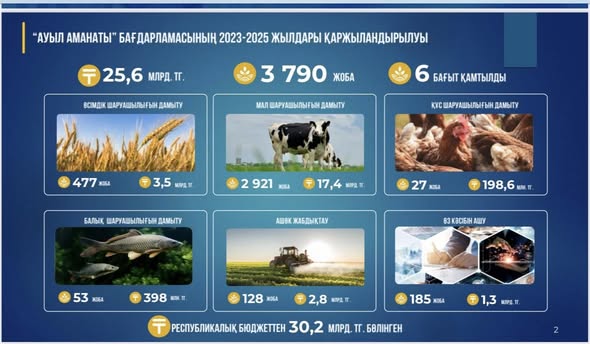 «Бағдарламаның жүзеге асуы өңірімізде айқын әрі нақты нәтижелер көрсетті. Оның ішінде ауылдық жердегі шағын кәсіпкерлік 3 662 бірлікке артты, 23,2 гектарға 477 бірлік жылыжай кешені салынды. Мал басы 72 982 бірлікке ұлғайды, 39 қайта өңдеу кәсіпорны іске қосылды, 4 174 жаңа жұмыс орны ашылды. Атаулы әлеуметтік көмек алушылар саны 441 адамға қысқарды. Жалпы, осы бағдарлама аясындағы жобалар есебінен жыл сайын шамамен 30 млрд. теңгенің ауыл шаруашылығы өнімі өндіріліп отыр» дейді баспасөз хабарламасында.