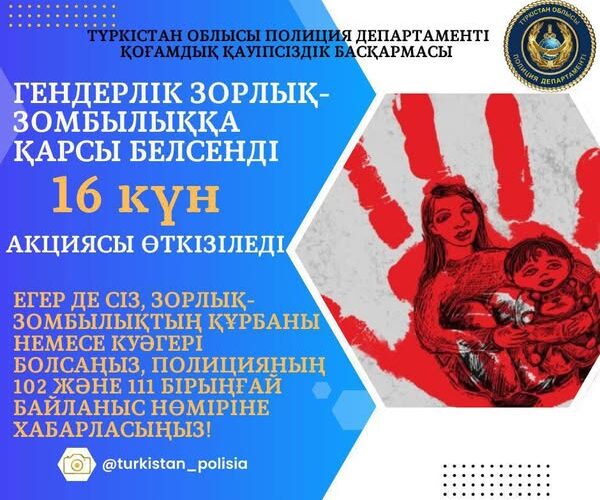 Түркістан облысында тұрмыстық зорлық-зомбылық мәселесіне назар аудару, құрбандардың құқықтарын қорғау және қайғылы оқиғалардың алдын алу мақсатында 25 қараша мен 10 желтоқсан аралығында «Гендерлік зорлық-зомбылыққа қарсы белсенді 16 күн!» акциясы басталады.