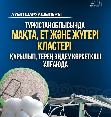 «Олар: мақта, ет және жүгері кластері. Су үнемдеу технологияларын қолдана отырып, мақтаның элиталық сорттарын өсіруді және шикізатты терең өңдеуді қамтитын мақта-тоқыма кластері құрылды. Кластер – өндірістік процестің барлық кезеңдерін қамтамасыз етеді, мақта өсіруден бастап, жіп, мата сияқты дайын тоқыма өнімдері өндіріледі. Мақта кластерінде 5 жобаны іске асыру нәтижесінде 7 мыңнан аса адам жұмыспен қамтылып, 201 млрд. теңге инвестиция тартылады деп күтіліп отыр. Мақта өнімділігі 2-3 есеге артады. Жылына 229 мың тонна мақта өндіріледі. Биыл пилот ретінде Отырар ауданында 32 мың гектар алқапқа жаңа әдіспен мақта егілді. Түсім өте жақсы болды. 2 мақта өңдеу зауыты іске қосылды. Жіп иіру фабрикасының құрылысы аяқталуда» деді Түркістан облысының әкімі Нұралхан Көшеров.
